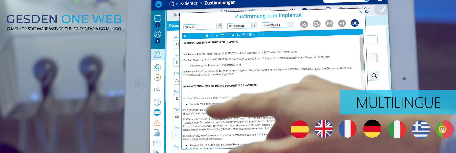 Gesden One permite adaptar o software ao idioma do paciente. O utilizador poderá escolher o idioma que precisar, mostrando a informação no ecrã e entregando ao paciente todos os documentos no seu idioma. A função multilingue confere à clínica um adicional de profissionalismo e distinção na atenção ao paciente, que se repercutirá numa maior satisfação deste.